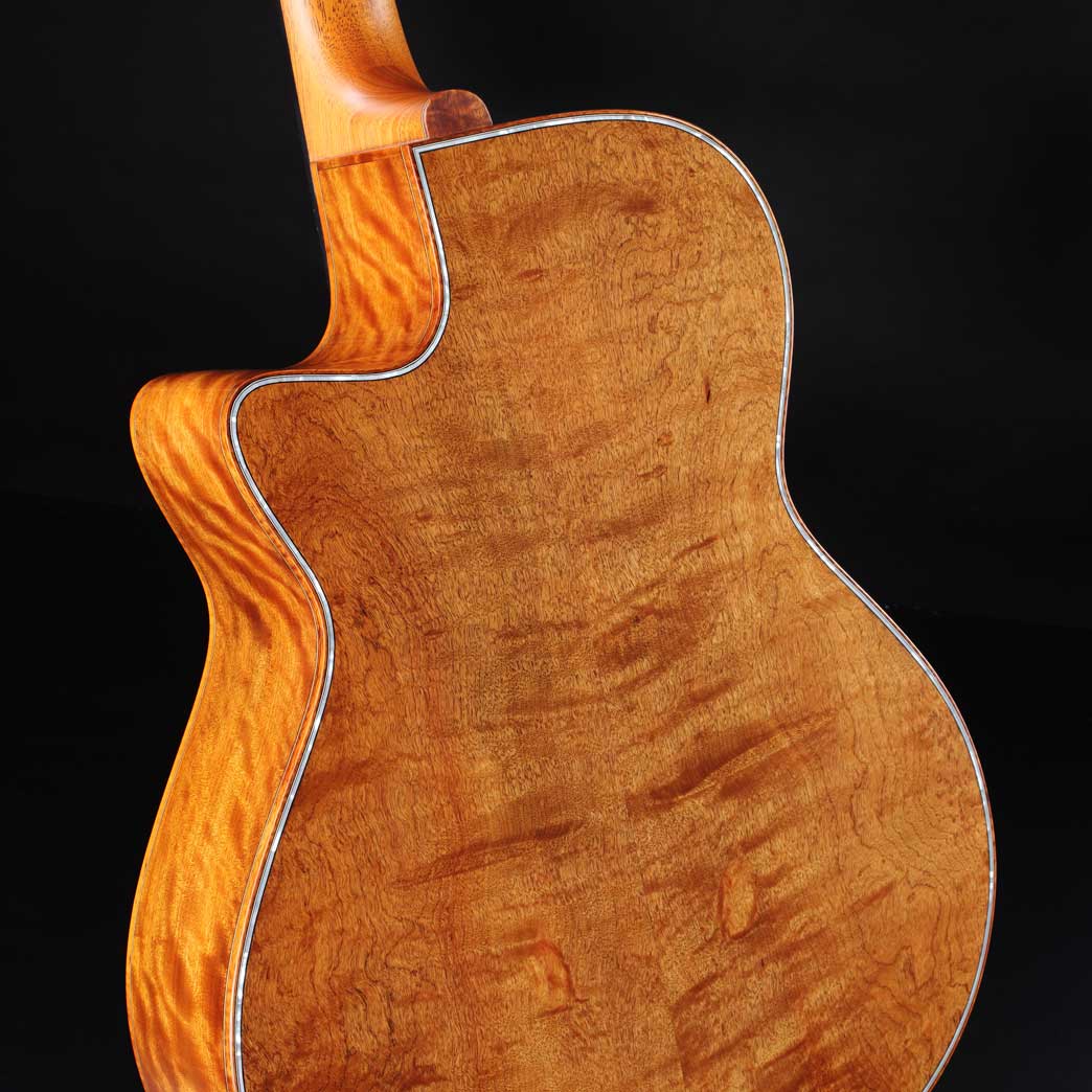 地杉の煌びやかな高音と柔らかな中域と、神護木の澄んだ柔らかい音色との組み合わせにより、絶妙なサウンドバランス。神護木の優雅で神秘的な杢目は、感動を誘う美しさです。