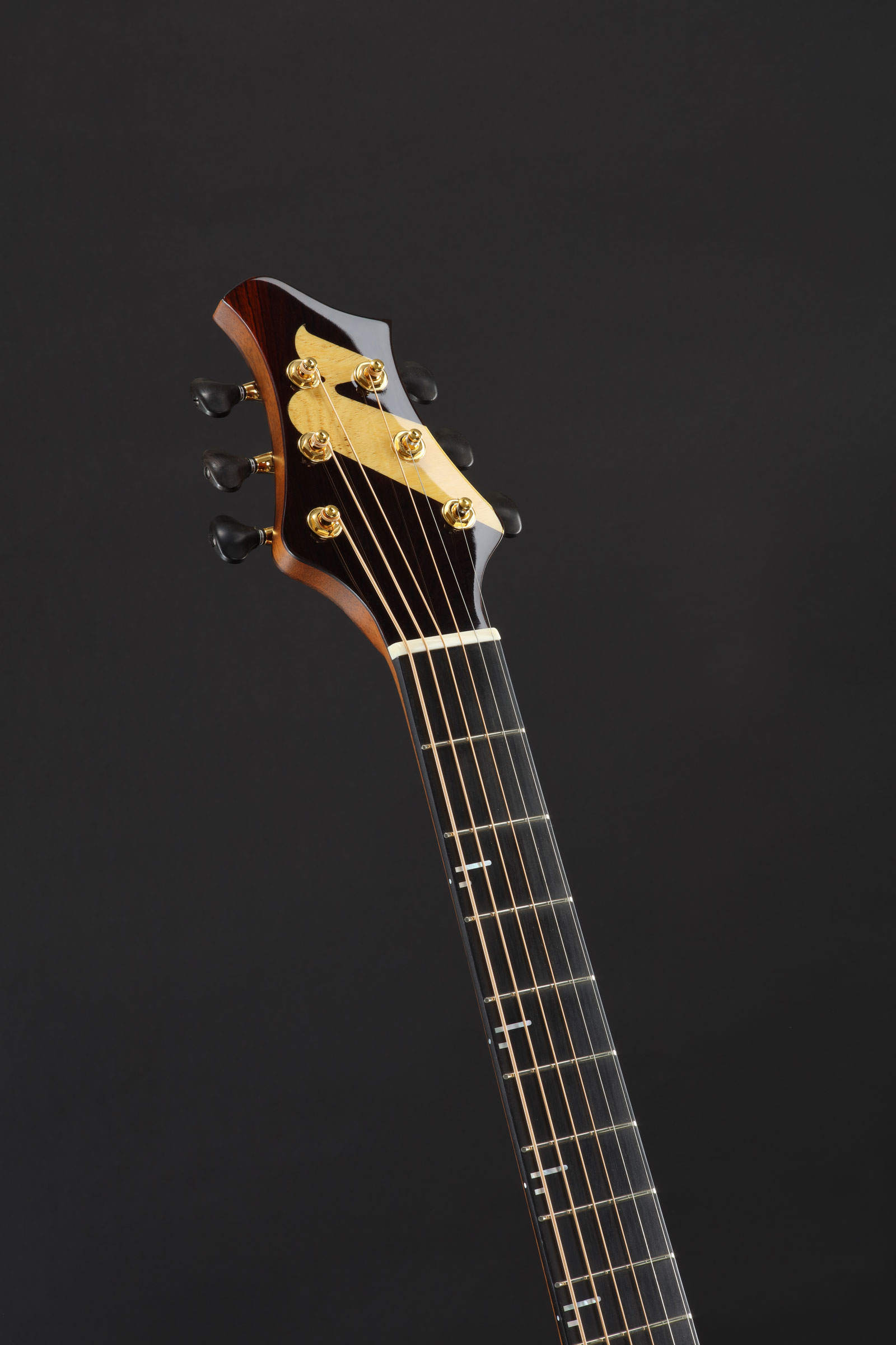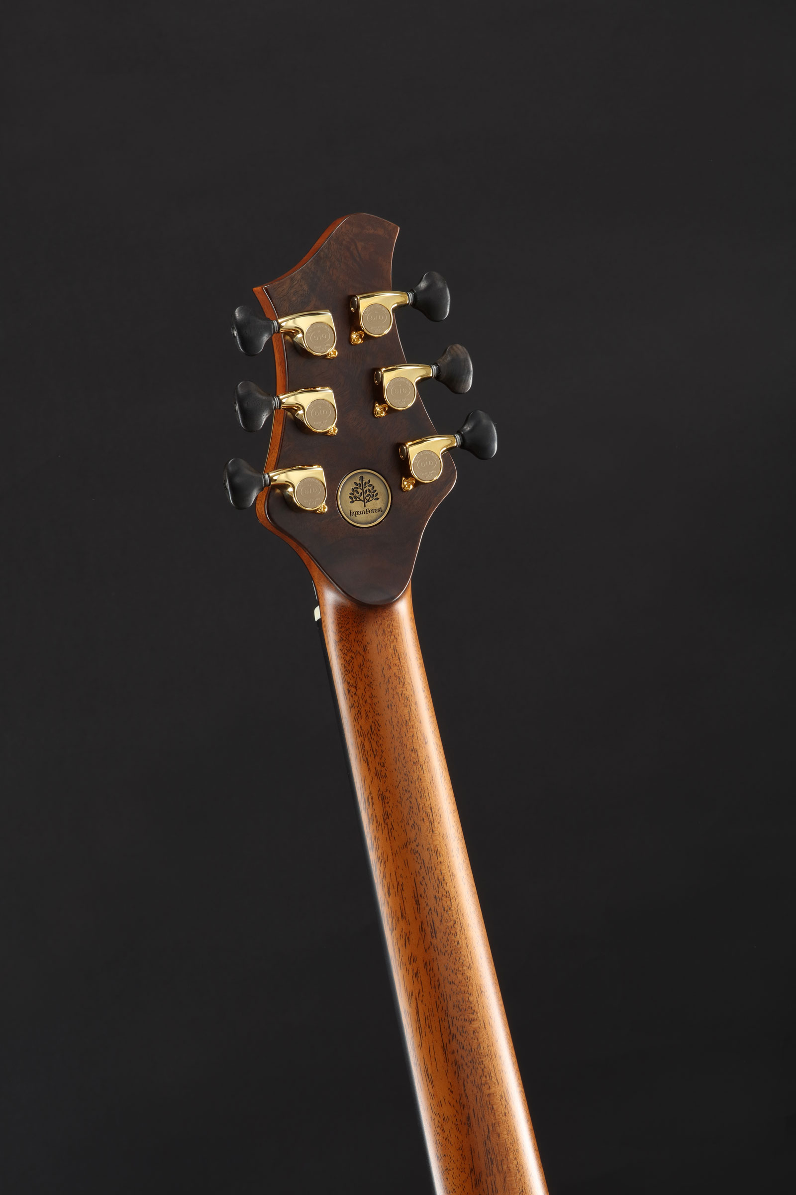 An original headstock design by master luthier Takumi Morinaka. Locally sourced Japanese cedar (Jisugi) from Miyazaki Prefecture is also used for the headplate and inlays, highlighting the natural beauty of the wood.